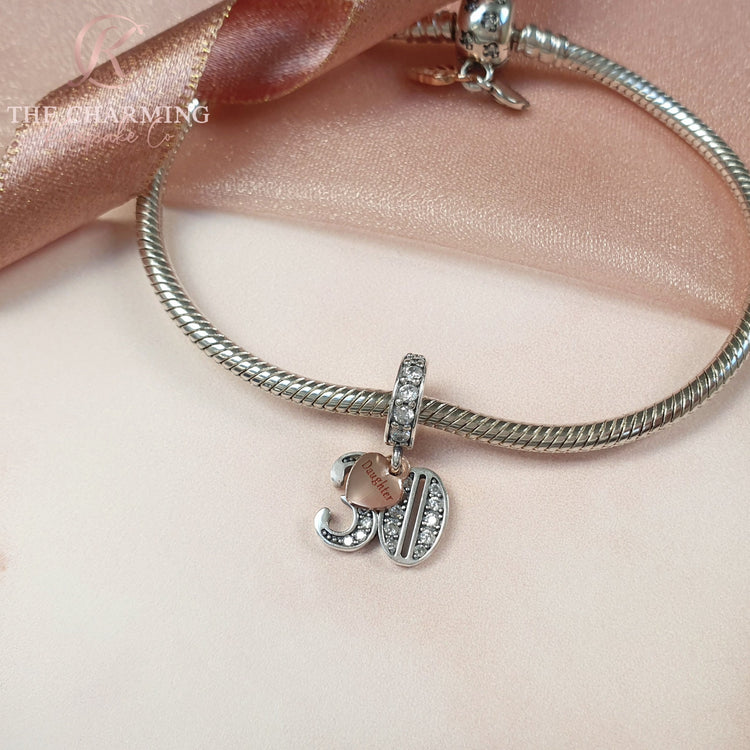 Beautiful and high quality two-tone rose gold and 925 sterling silver dangle charm featuring the numbers 30 decorated with sparkling clear cubic zirconia crystals and a small rose gold plated heart pendant engraved with 'Daughter'; the perfect gift for your Daughter on their milestone Birthday.