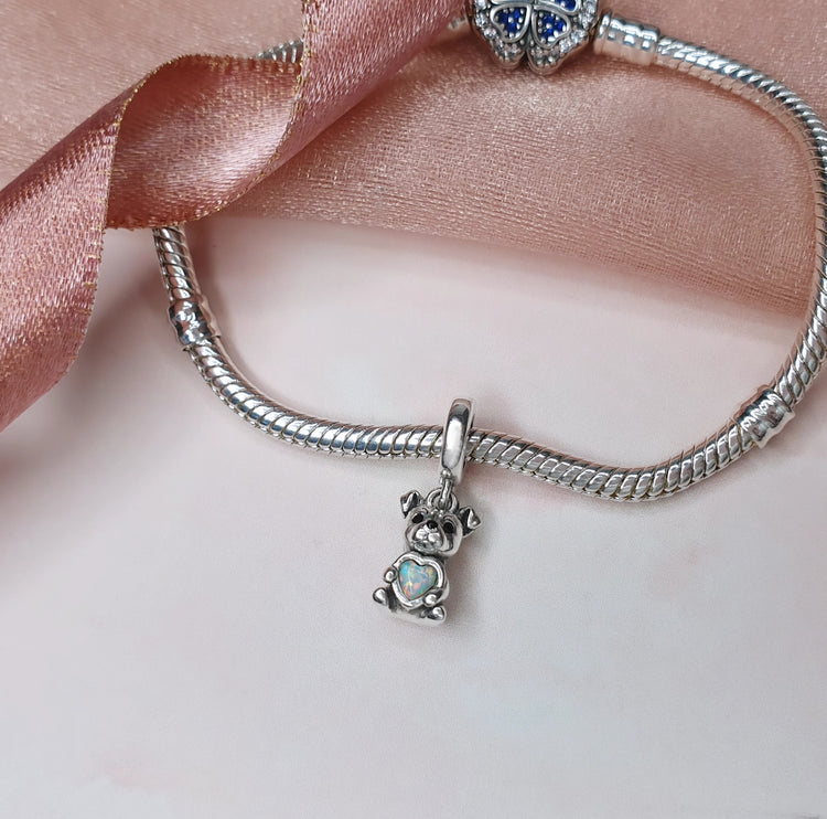 Strong, loyal, and full of love, this Staffy–inspired puppy charm beautifully captures the gentle heart of these devoted companions. Crafted from 925 sterling silver, the design features a sweet, rounded face, floppy ears, and expressive eyes that reflect the affectionate nature that Staffies and Pit Bulls are known for. Held close in its paws is a shimmering opal heart symbolizing unconditional love, loyalty, and trust.