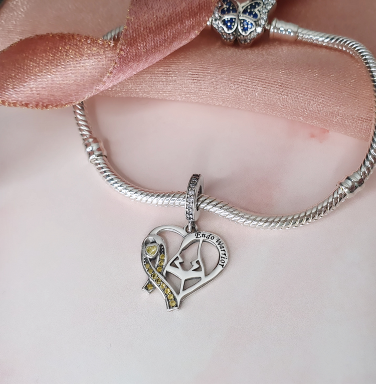 Carry strength, courage, and solidarity with you wherever you go with this beautiful heart-shaped dangle charm. Crafted from high-quality 925 Sterling Silver, it features a shimmering yellow crystal ribbon — a symbol of hope for everyone fighting endometriosis. Inside the heart lies a delicate outline of a woman’s abdomen, capturing the invisible pain so many endure in silence. The engraving “Endo Warrior” honours the resilience of those battling this life-altering condition every day.