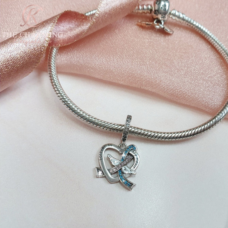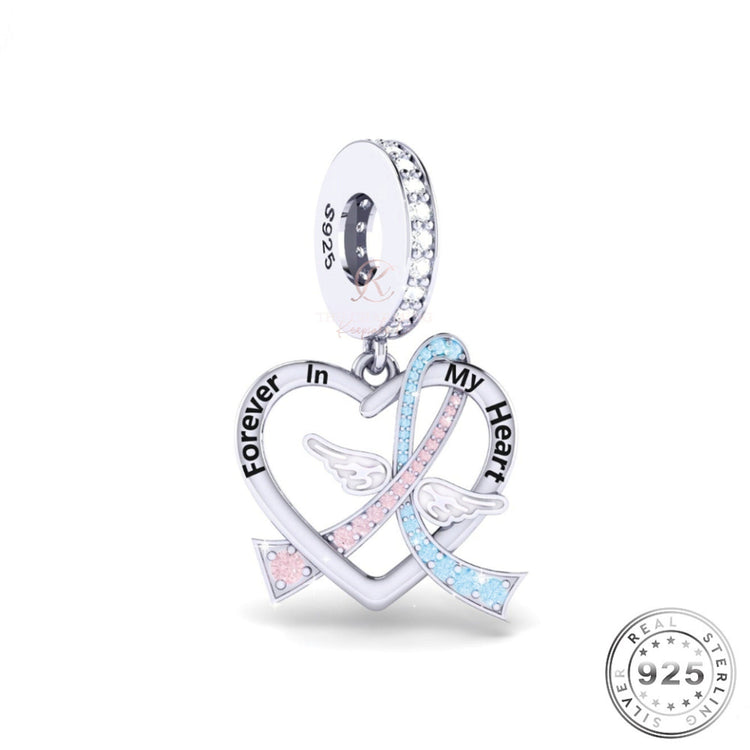 Forever In My Heart Angel Wings Charm 925 Sterling Silver - Baby Loss Awareness Ribbon