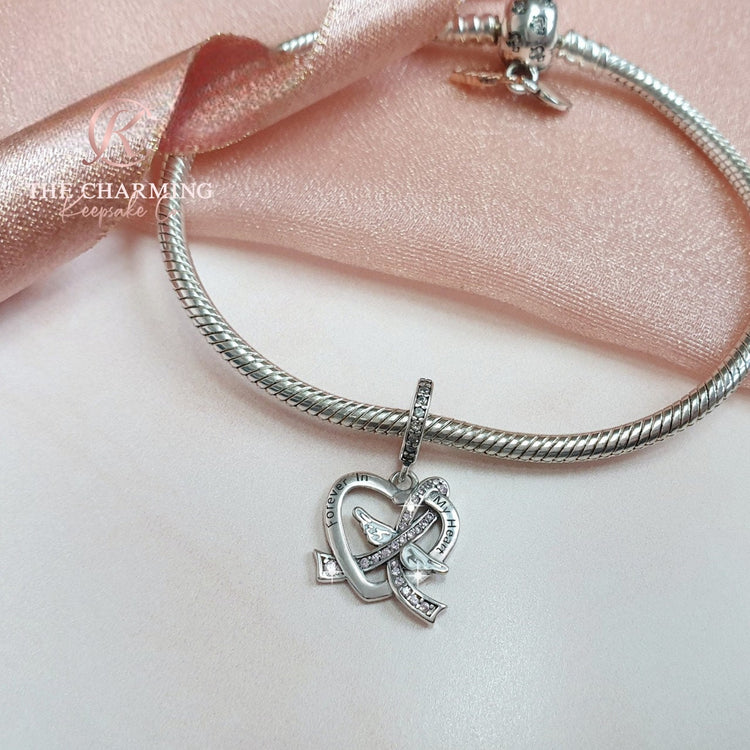 Beautiful heart shaped dangle charm crafted from high quality 925 Sterling Silver featuring a pink crystal embellished ribbon with angel wings entwined through the heart. The charm is inscribed with 'Forever In My Heart'. The pink ribbon symbolises Cancer Awareness; a meaningful addition to your charm bracelet to remember a passed loved one.