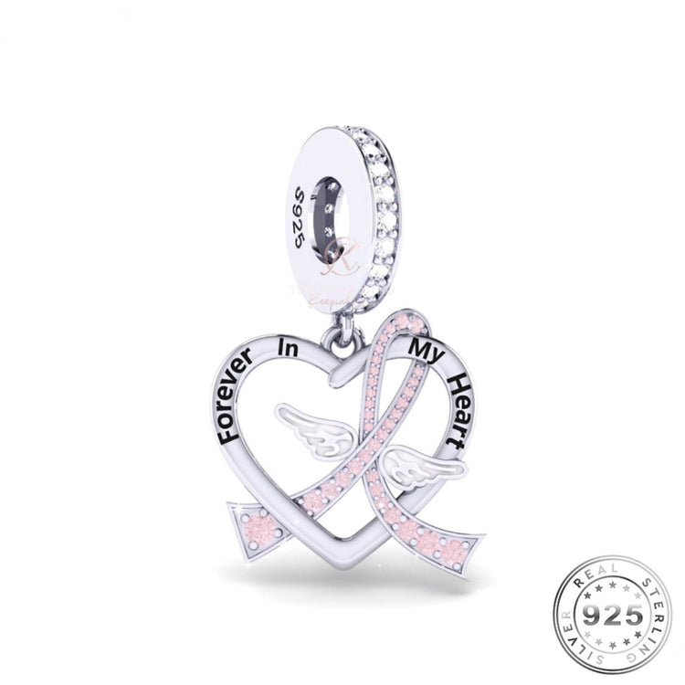 Forever In My Heart Angel Wings Charm 925 Sterling Silver - Pink Cancer Ribbon
