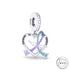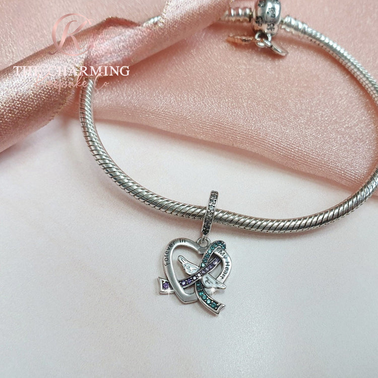 Beautiful heart shaped dangle charm crafted from high quality 925 Sterling Silver featuring a teal and purple crystal embellished ribbon with angel wings entwined through the heart. The charm is inscribed with 'Forever In My Heart'. The teal and purple ribbon symbolises suicide awareness; a meaningful addition to your charm bracelet to commemorate a passed loved one.