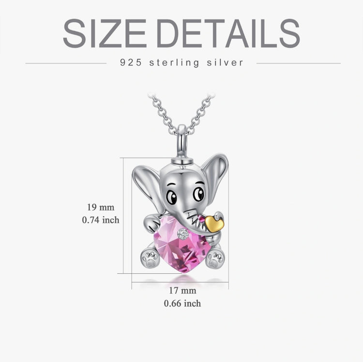 Keep your loved one close to your heart with this gorgeous ashes urn necklace. Crafted from high quality 925 sterling silver, the necklace features a baby Elephant holding a sparkling pink crystal heart.