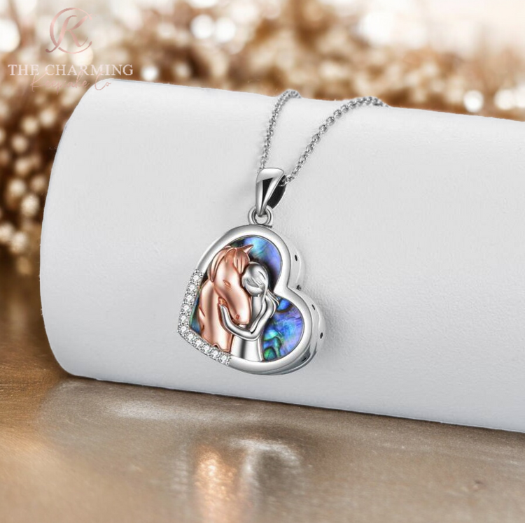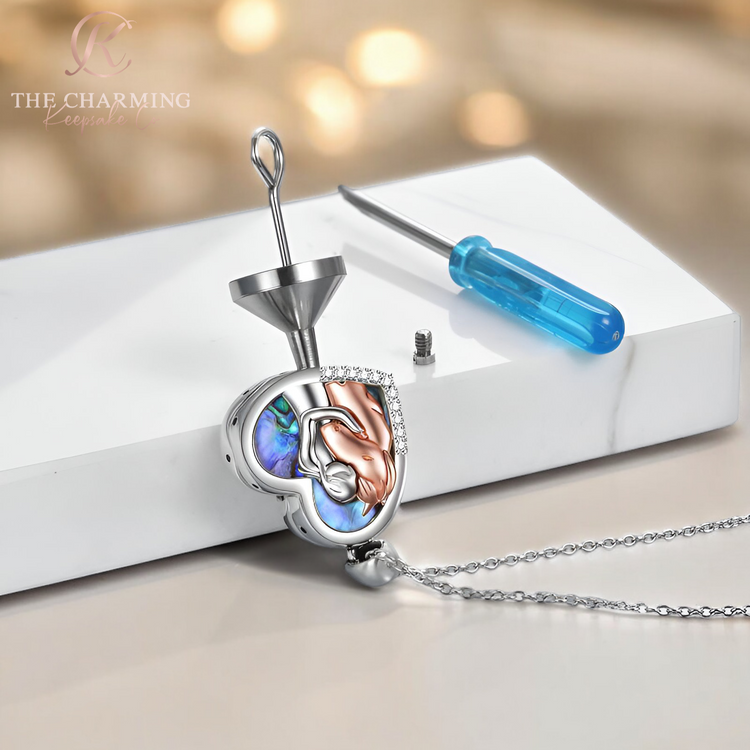 Keep your loved one close to your heart with this gorgeous two-tone rose gold and silver ashes urn necklace. Crafted from high quality 925 sterling silver, the necklace features a heart shaped pendant beautiful decorated with abalone shell. Within the heart is a girl lovingly holding her horse.