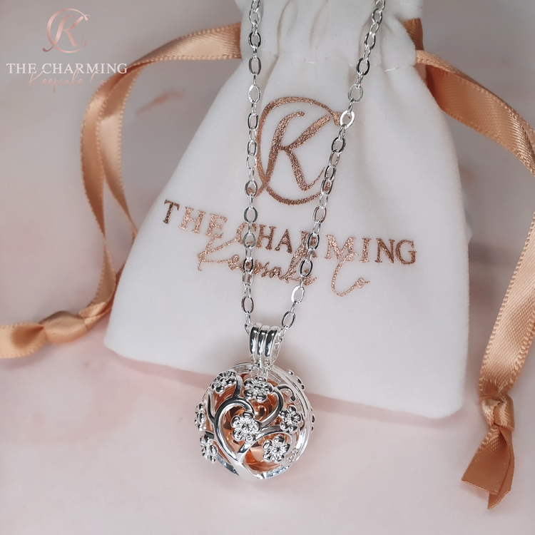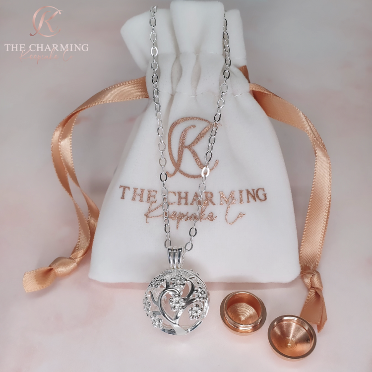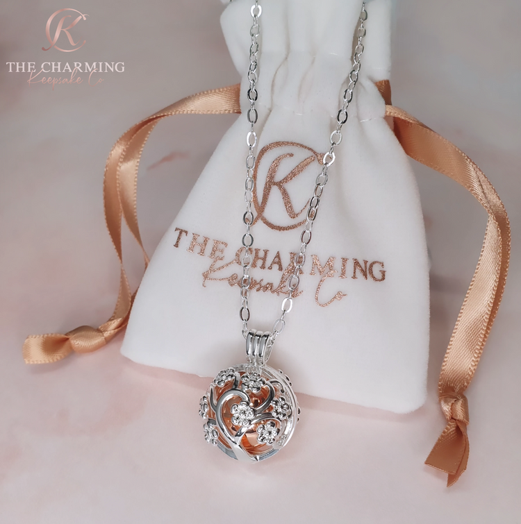 Keep your loved one close to your heart with this stunning necklace, which can hold ashes or hair inside. Crafted from high quality silver plated stainless steel, the necklace features an openwork cage pendant intricately designed with a family tree. The necklace cage opens up to reveal a rose gold ball inside which unscrews to place the ashes or hair inside. We can engrave the ball with one word on either side.