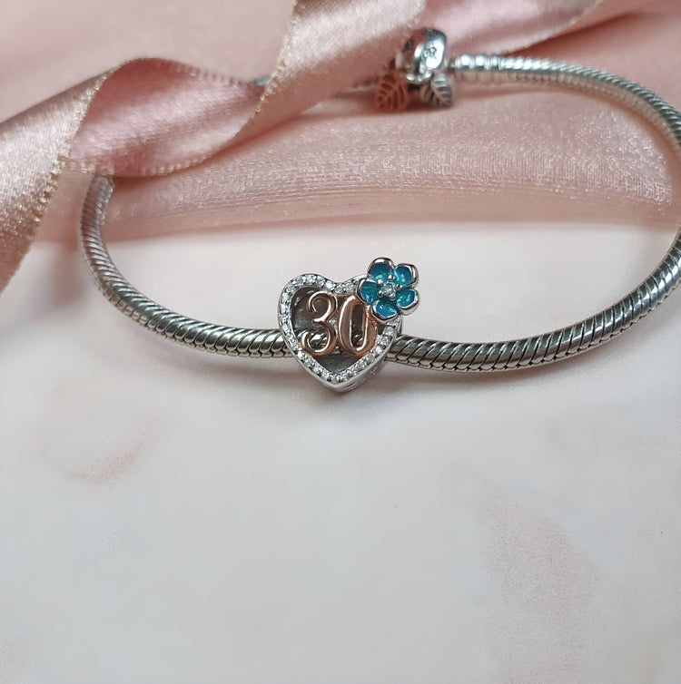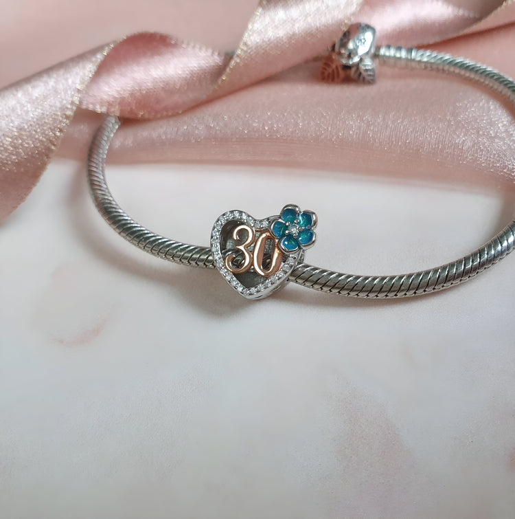 Beautiful and high quality 925 sterling silver heart shaped charm embellished with sparkling clear cubic zirconia crystals and a small flower decorated with two-tone teal enamel. The charm features the number 30 in rose gold plating and heart cutout detailing at the sides. The reverse of the heart charm can be personalised with your chosen text; the perfect gift for someone special on their milestone birthday.