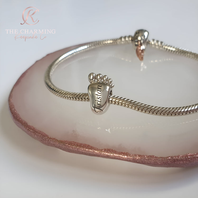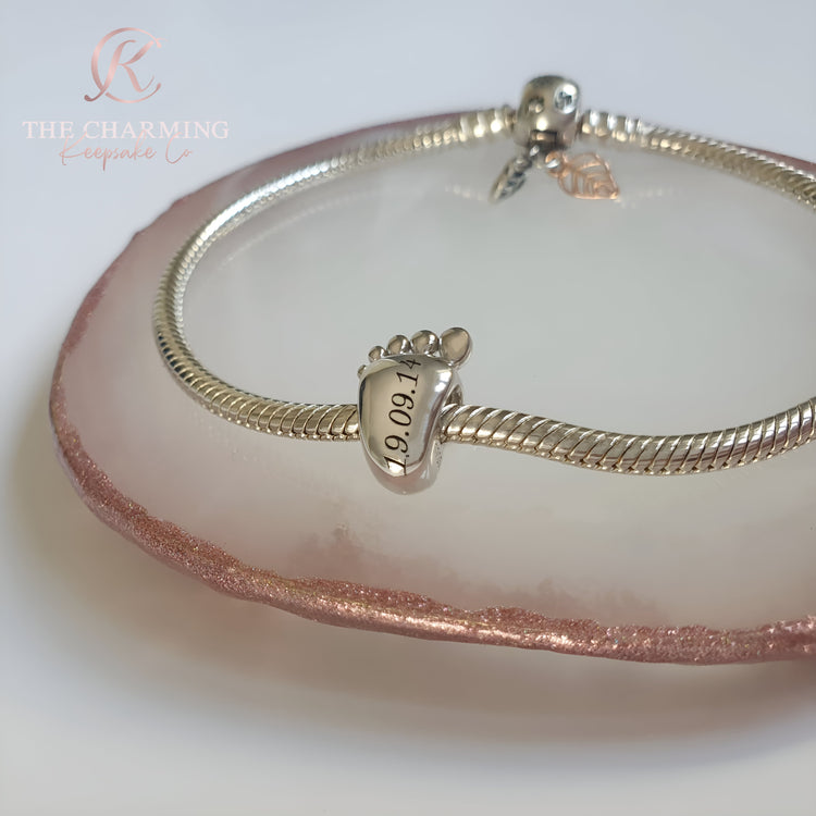 Engraved Baby Footprint Charm 925 Sterling Silver - Personalised with your text ( fits pandora )