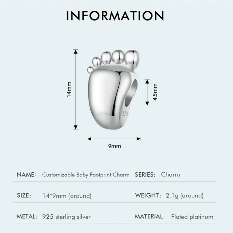 Beautiful and high quality 925 sterling silver baby footprint charm. The charm can be personalised with your chosen text on the front and reverse.