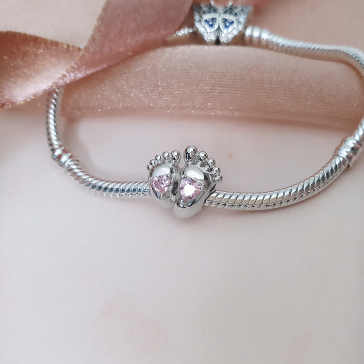 Stunning and high quality 925 sterling silver charm featuring two feet embellished with sparkling pink cubic zirconia crystal hearts. The charm can be personalised with one word on the reverse.
