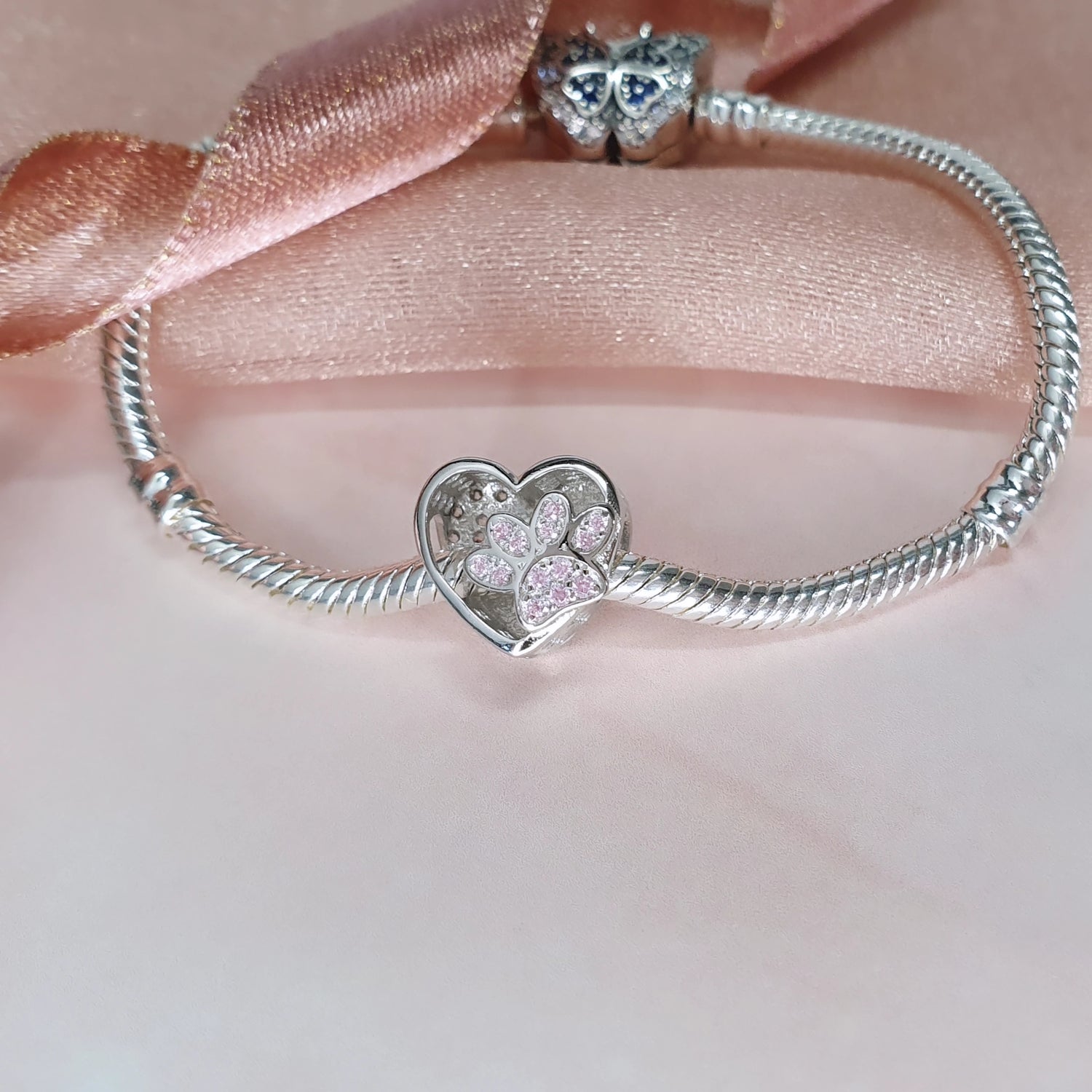 Beautiful and high quality 925 sterling silver openwork heart shaped charm featuring a sparkling pink cubic zirconia encrusted paw on one side. The reverse of the charm has a small pink crystal encrusted paw and is engravable with your chosen words.