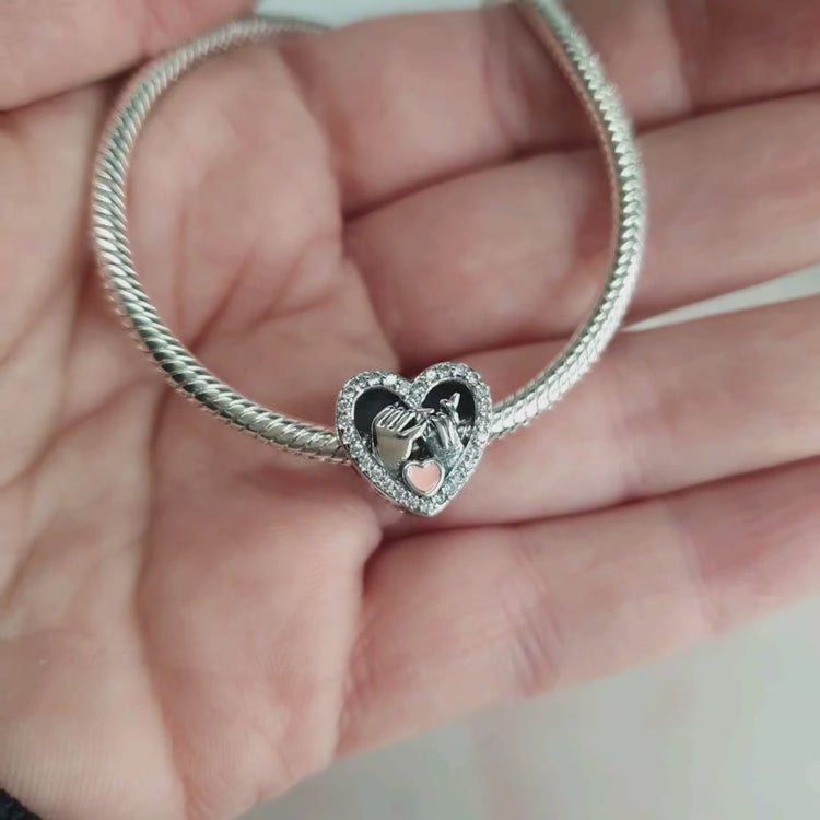 Stunning and high quality 925 sterling silver charm featuring loving hands held together within a sparkling cubic zirconia crystal embellished heart design. The charm also features heart cutout detail at the sides.
