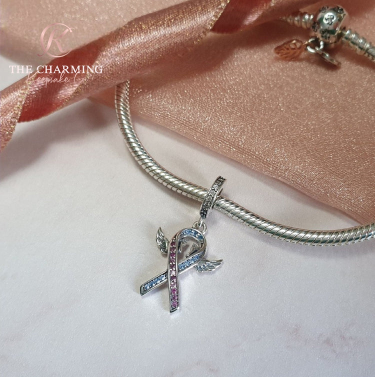 Beautiful dangle charm crafted from high quality 925 Sterling Silver featuring an infant loss awareness ribbon decorated with pink and blue cubic zirconia crystals. The ribbon features baby feet and angel wings on either side symbolising an infant who has gained his or her angel wings; a meaningful addition to your charm bracelet or gift for someone special.