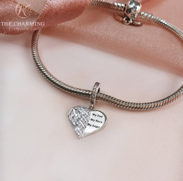 Beautiful  925 sterling silver heart shaped dangle charm featuring an angel wing on one side decorated with sparkling clear cubic zirconia crystals. The charm is inscribed with 'My Dad My Hero My Angel'; a meaningful addition for your charm bracelet or gift for someone special.