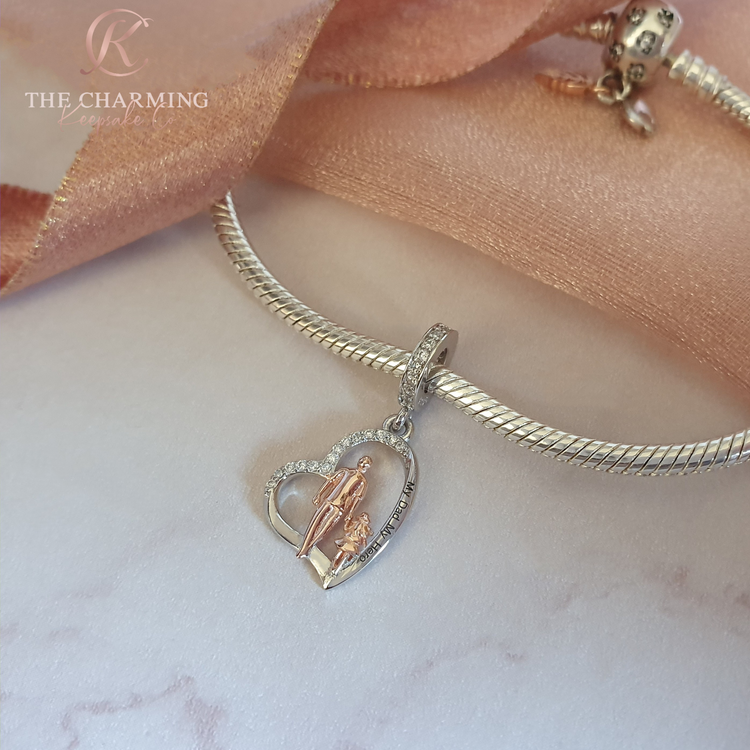 Beautiful and high quality 925 sterling silver charm featuring a heart shaped pendant decorated with sparkling clear cubic zirconia crystals. Within the heart are rose gold father and daughter figurines holding hands. The charm is inscribed with 'My Dad My Hero'; a gorgeous addition for your charm bracelet or gift for someone special.