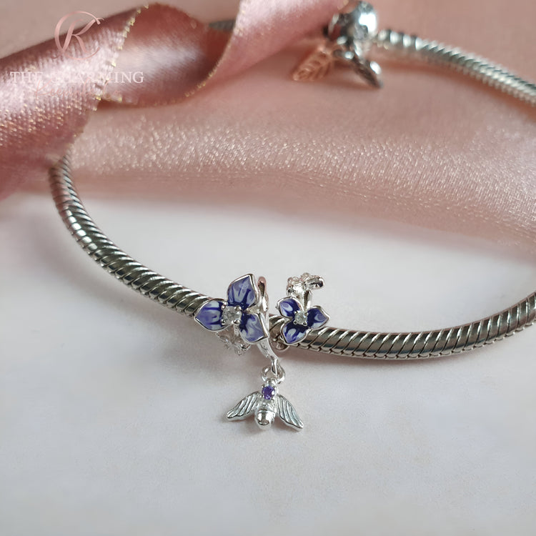 Flowers & Bee Charm 925 Sterling Silver & Purple