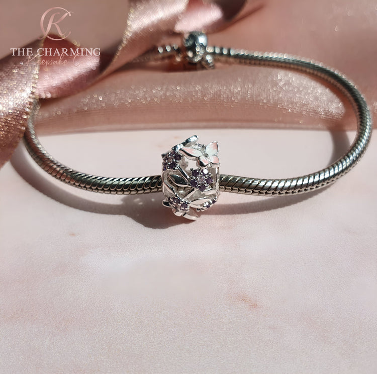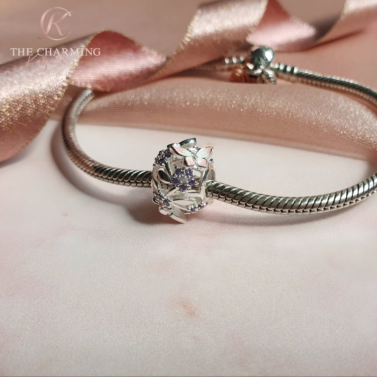 Stunning and high quality 925 sterling silver openwork charm intricately decorated with gorgeous pastel purple and pink flowers and butterflies, embellished with sparkling cubic zirconia crystals; a lovely addition for your charm bracelet or gift for someone special.