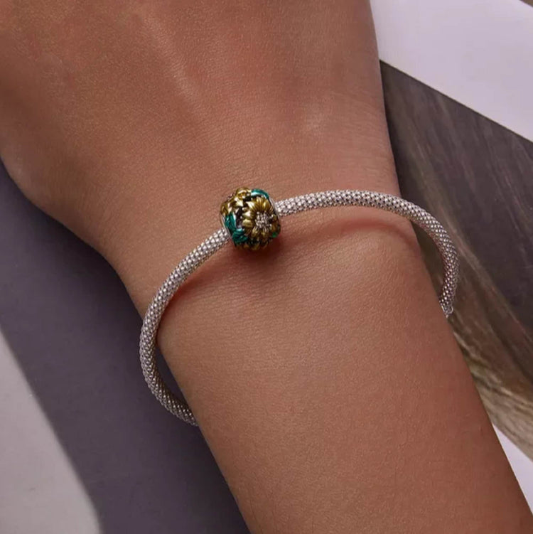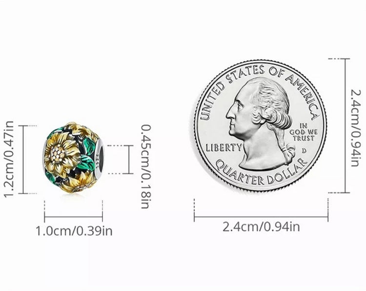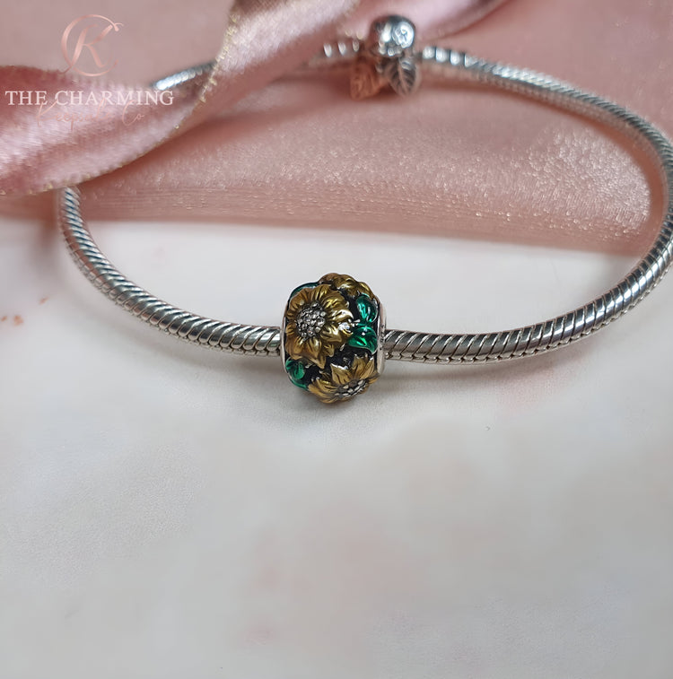 Beautiful and high quality 925 sterling silver charm decorated with yellow and green enamel Sunflowers embellished with sparkling yellow cubic zirconia crystals; a lovely addition for your charm bracelet or gift for someone special.