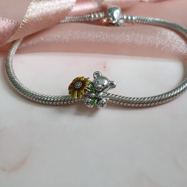 Beautiful and high quality 925 sterling silver charm featuring a cute teddy bear holding a gorgeous Sunflower hand finished with yellow and green enamel; a lovely addition for your charm bracelet or gift for someone special.