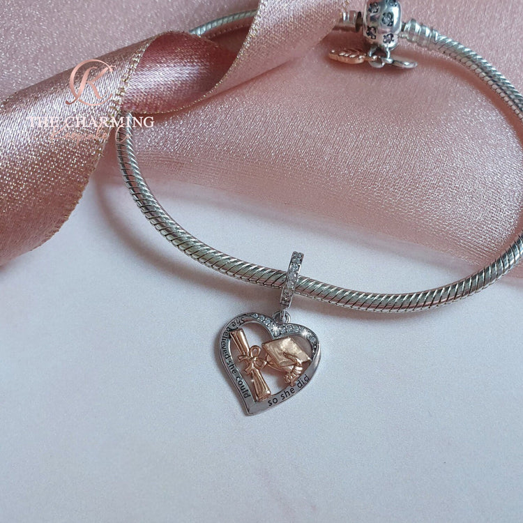Graduation Heart Dangle Charm 925 Sterling Silver & Rose Gold