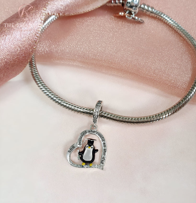 Beautiful and high quality 925 sterling silver heart shaped pendant charm featuring a Penguin with a graduation cap and scroll in hand. The charm is decorated with sparkling clear cubic zirconia crystals and engraved with the words 'She believed she could so she did'; a gorgeous addition for your charm bracelet or meaningful gift for someone special.