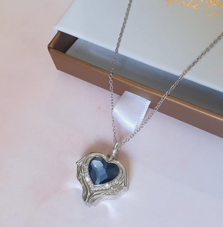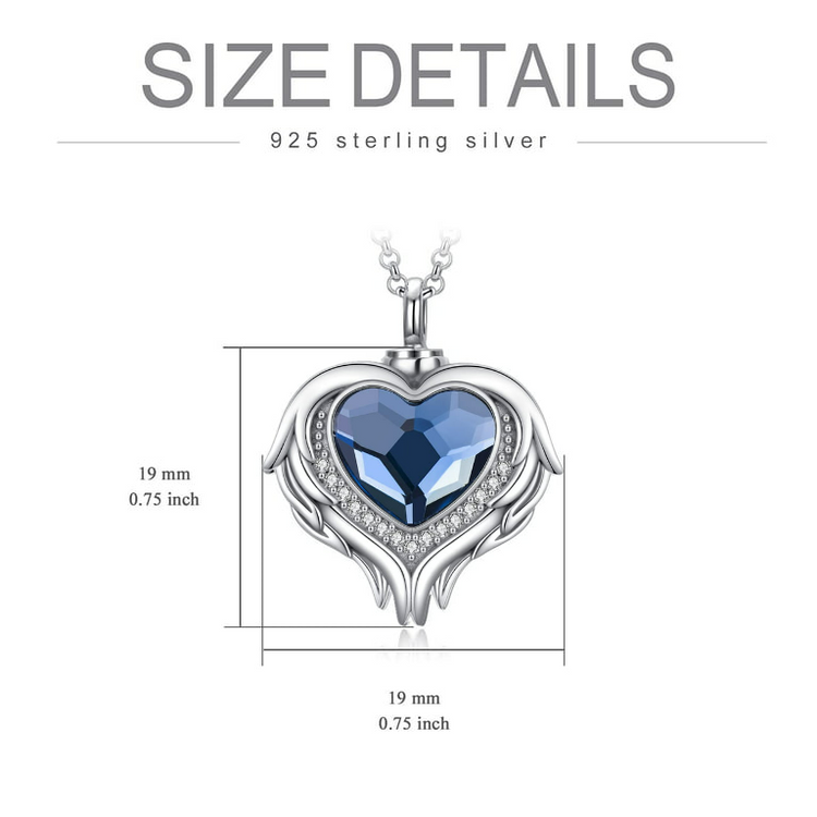 Keep your loved one close to your heart with this gorgeous ashes urn necklace. Crafted from high quality 925 sterling silver, the necklace features a heart shaped pendant decorated with a shimmering blue faceted crystal surrounded by small cubic zirconia crystals and beautiful angel wings.