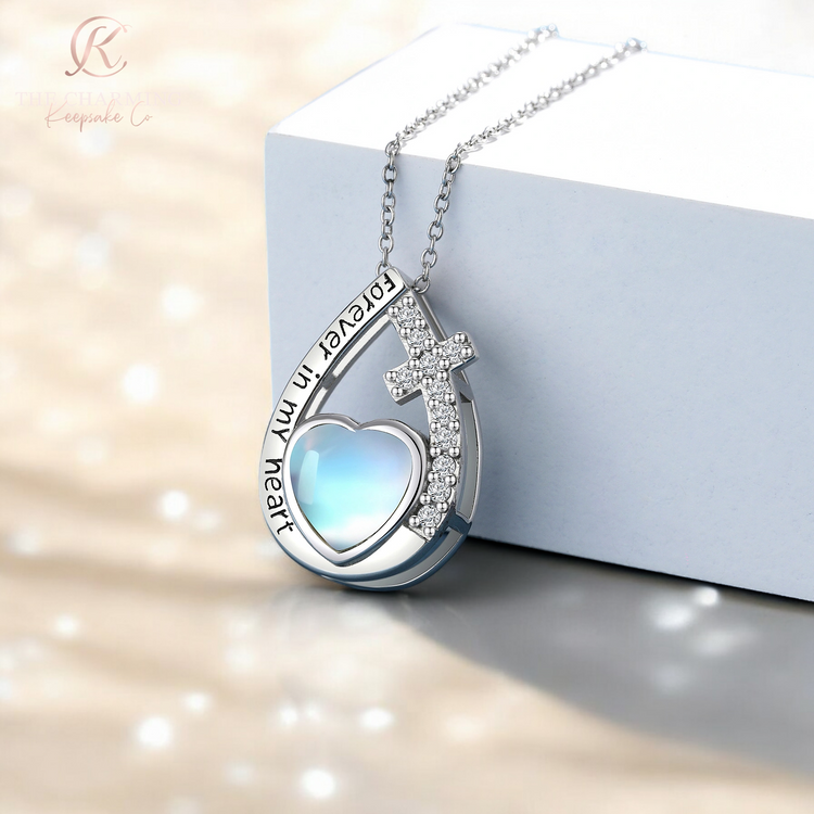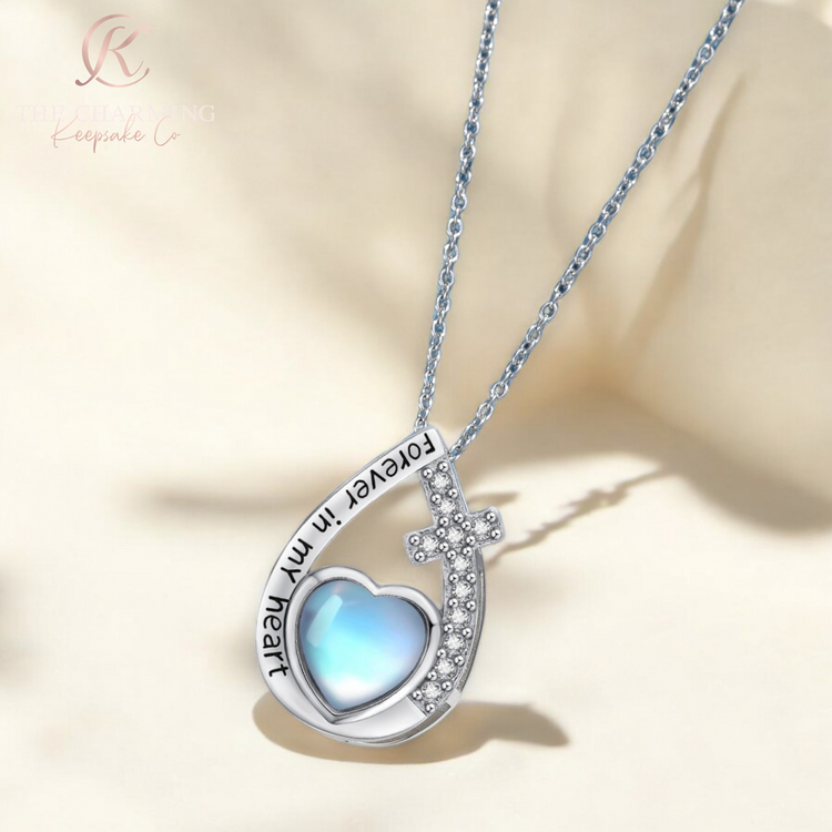 Cross and Heart Cremation Ashes Urn Necklace 925 Sterling Silver & Moonstone