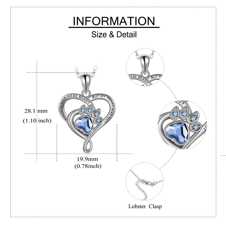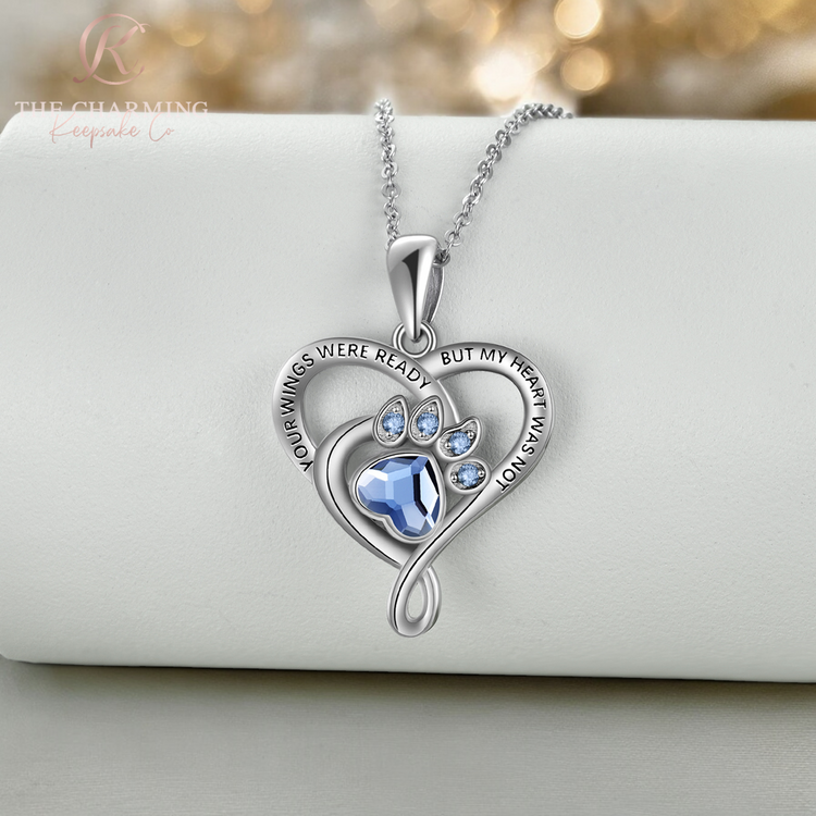 Keep your much loved pet close to your heart with this stunning ashes urn necklace. Crafted from high quality 925 sterling silver, the necklace features a heart shaped pendant decorated with a sparkling blue cubic zirconia crystal encrusted paw. The pendant is engraved with 'Your Wings Were Ready But My Heart Was Not'.