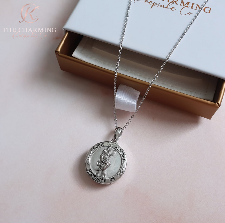 Keep your loved one close to your heart with this meaningful ashes urn necklace. Crafted from high quality 925 sterling silver, the necklace features a circular shaped pendant decorated with an image of Saint Christopher.