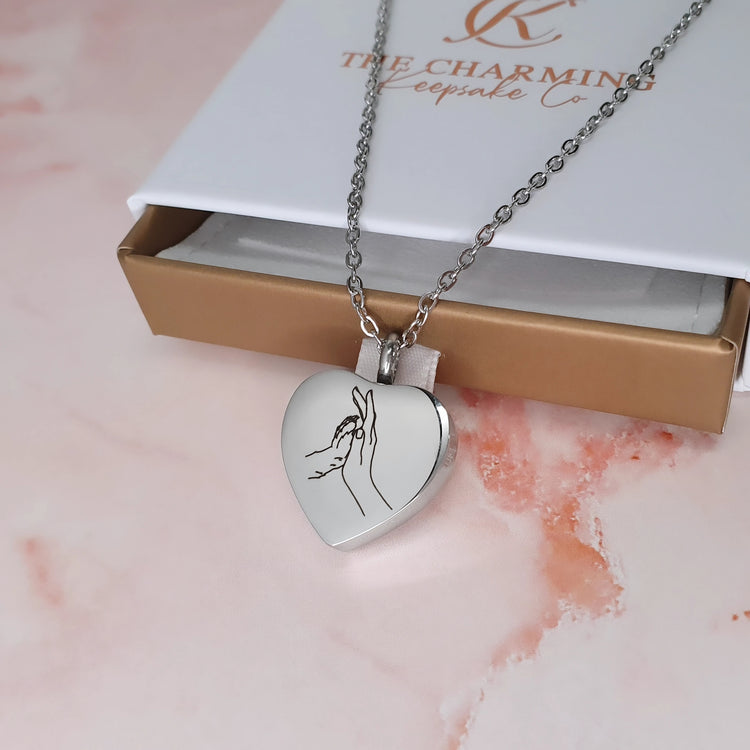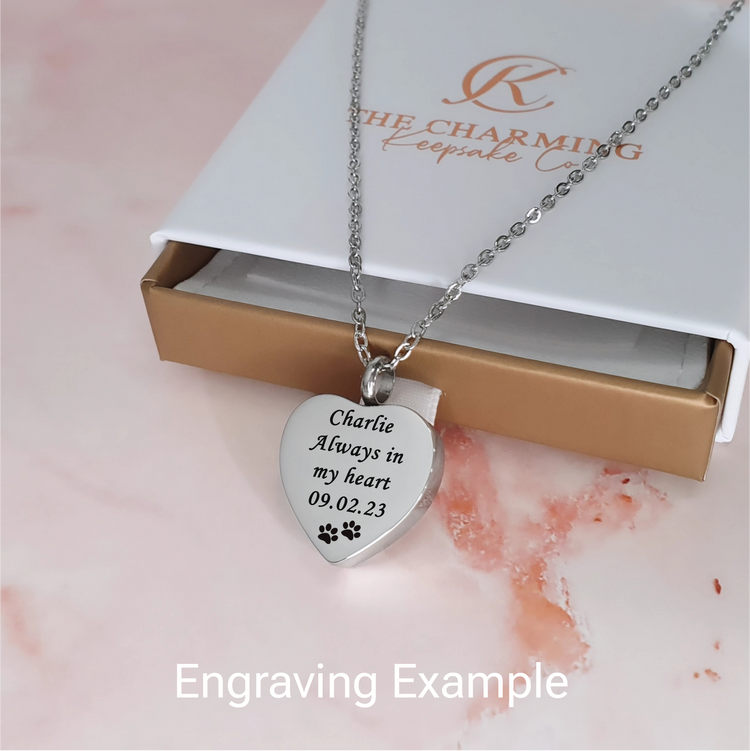 Keep your loved one close to your heart with this gorgeous heart shaped ashes necklace. The necklace is crafted from high quality stainless steel and features a paw and hand held together. The reverse of the necklace pendant is engravable with your chosen words.