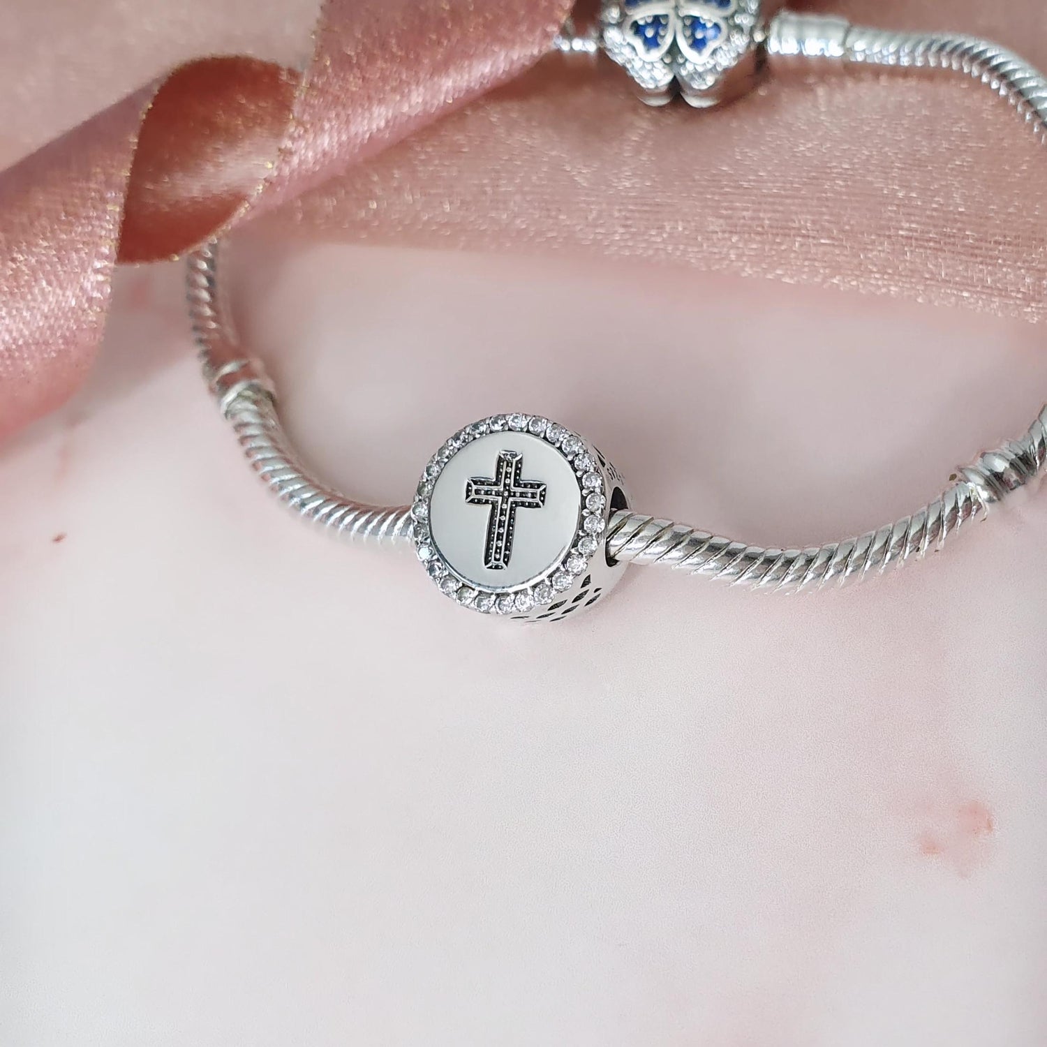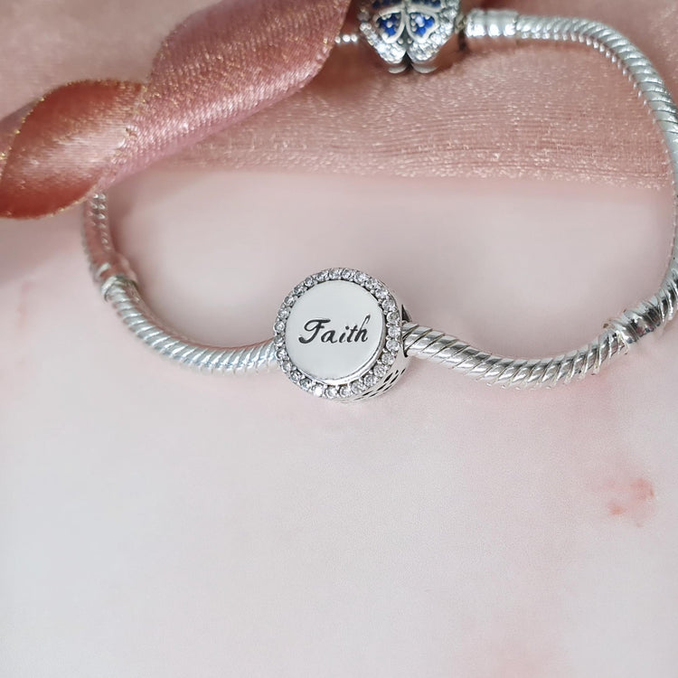 Beautiful and high quality 925 sterling silver circular charm embellished with sparkling cubic zirconia crystals and featuring a Cross on one side and 'Faith' on the reverse.