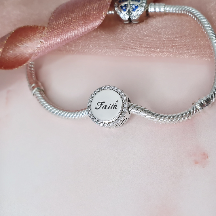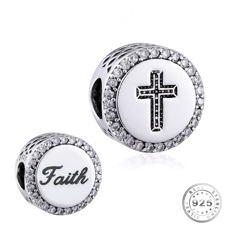 Beautiful and high quality 925 sterling silver circular charm embellished with sparkling cubic zirconia crystals and featuring a Cross on one side and 'Faith' on the reverse; a meaningful addition for your charm bracelet or gift for someone special.