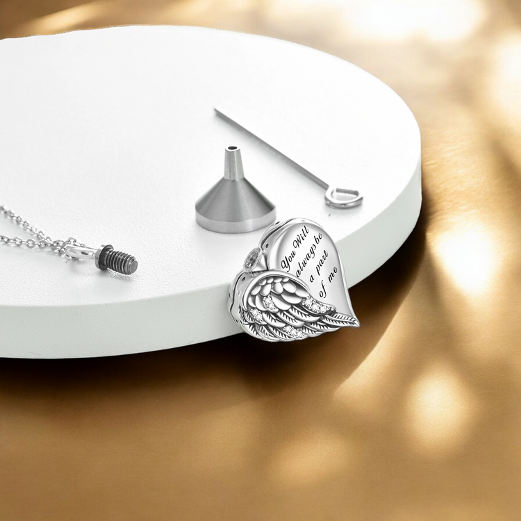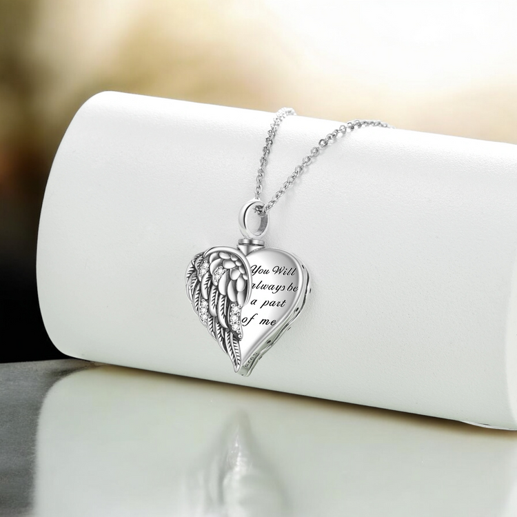 Keep your loved one close to your heart with this gorgeous ashes necklace. Crafted from high quality 925 sterling silver, the necklace features a heart pendant intricately decorated with an angel wing on one side and shimmering cubic zirconia crystals. The necklace is engraved with 'You will always be a part of me'.