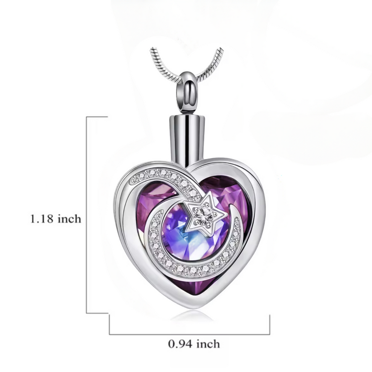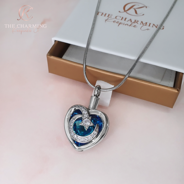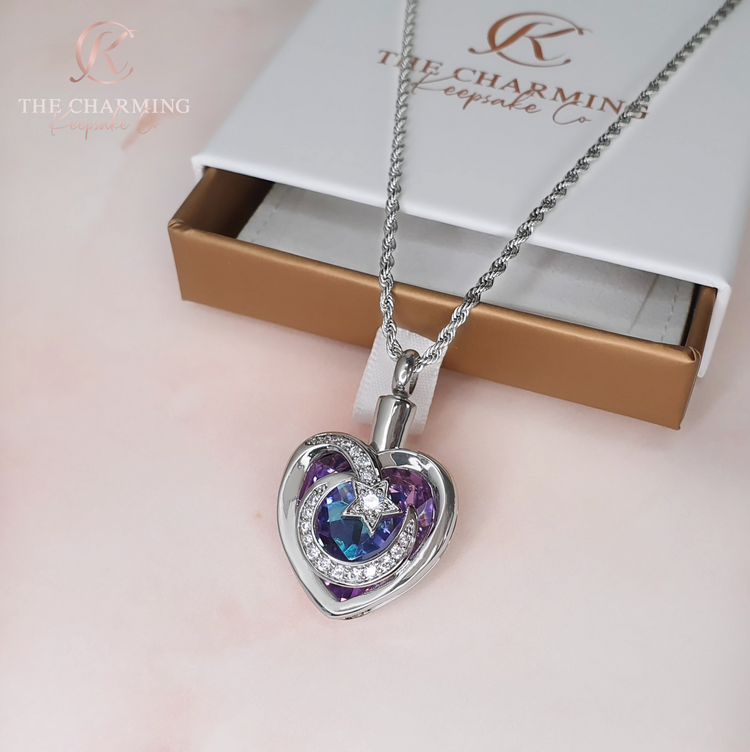 Keep your loved one close to your heart with this gorgeous heart shaped ashes necklace. The necklace is crafted from high quality polished stainless steel and features a crystal embellished moon and star design set across a sparkling faceted two-tone crystal heart.