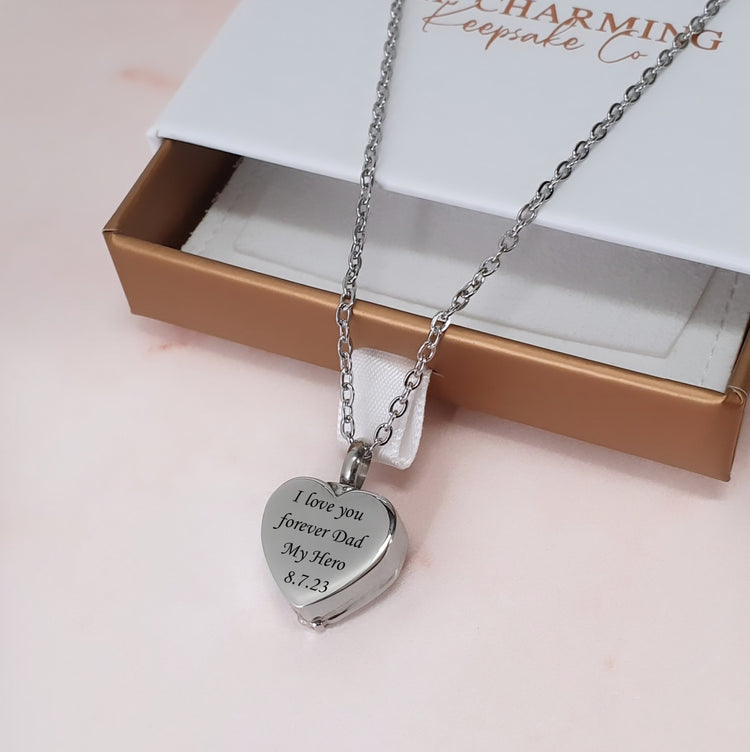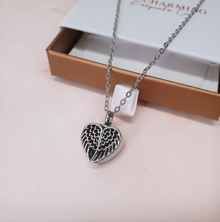 Keep your loved one close to your heart with this gorgeous heart shaped ashes necklace. The necklace is crafted from stainless steel and features a heart pendant decorated with angel wings.