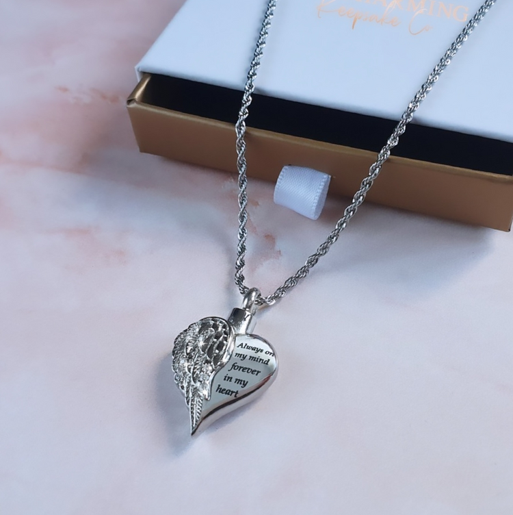Keep your loved one close to your heart with this gorgeous Angel Wing ashes necklace. The necklace is crafted from high quality polished stainless steel and features a heart pendant intricately decorated with an angel wing on one side and an engraving on the other side which reads 'Always on my mind, forever in my heart'.