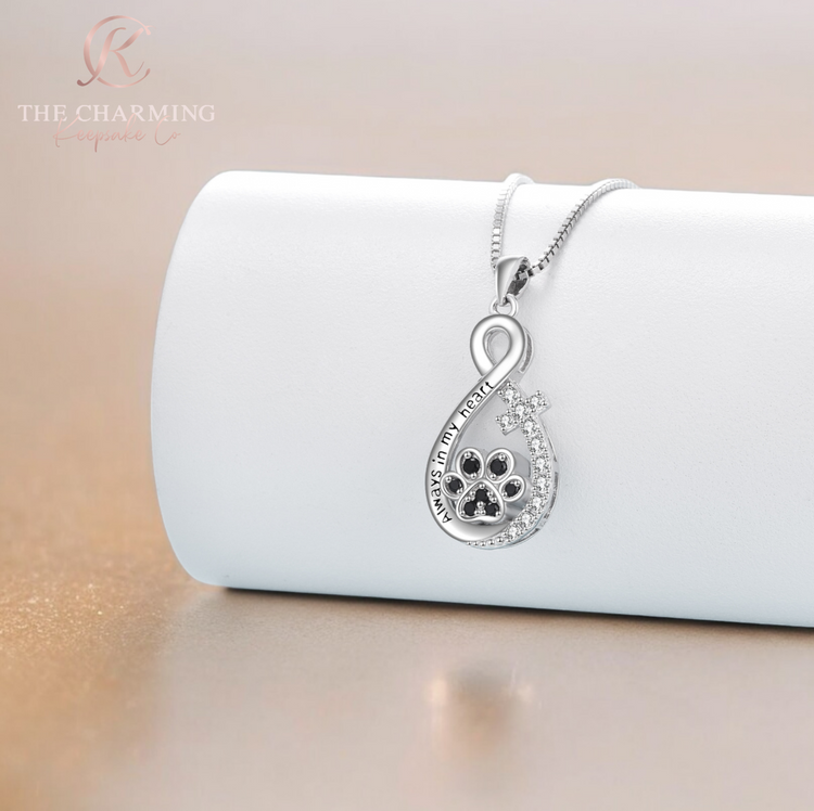 Keep your much loved pet close to your heart with this stunning ashes urn necklace. Crafted from high quality 925 sterling silver, the necklace features an infinity shaped pendant decorated with a sparkling clear cubic zirconia crystal cross and black crystal encrusted paw. The pendant is engraved with 'Always in my heart'.
