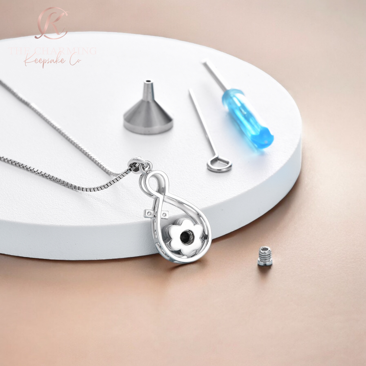 Your ashes necklace will be beautifully packaged in our Charming Keepsake Co white and rose gold pull out drawer necklace gift box (with a white suede pouch inside holding the necklace).