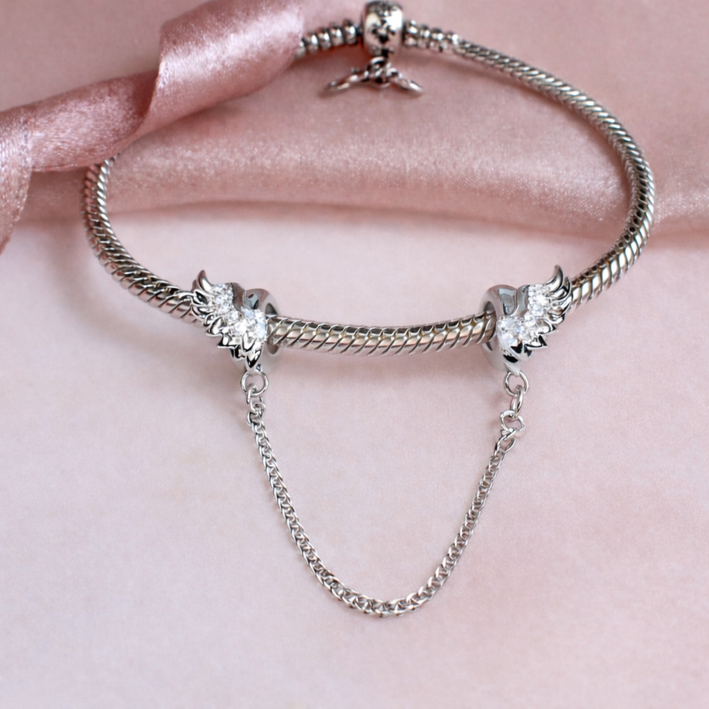 Secure your charm bracelet with an elegant, high-quality safety chain. Crafted from 925 sterling silver and featuring gorgeous angel wings embellished with sparkling clear cubic zirconia crystals the safety chain will make sure that your charms stay safely on your charm bracelet.