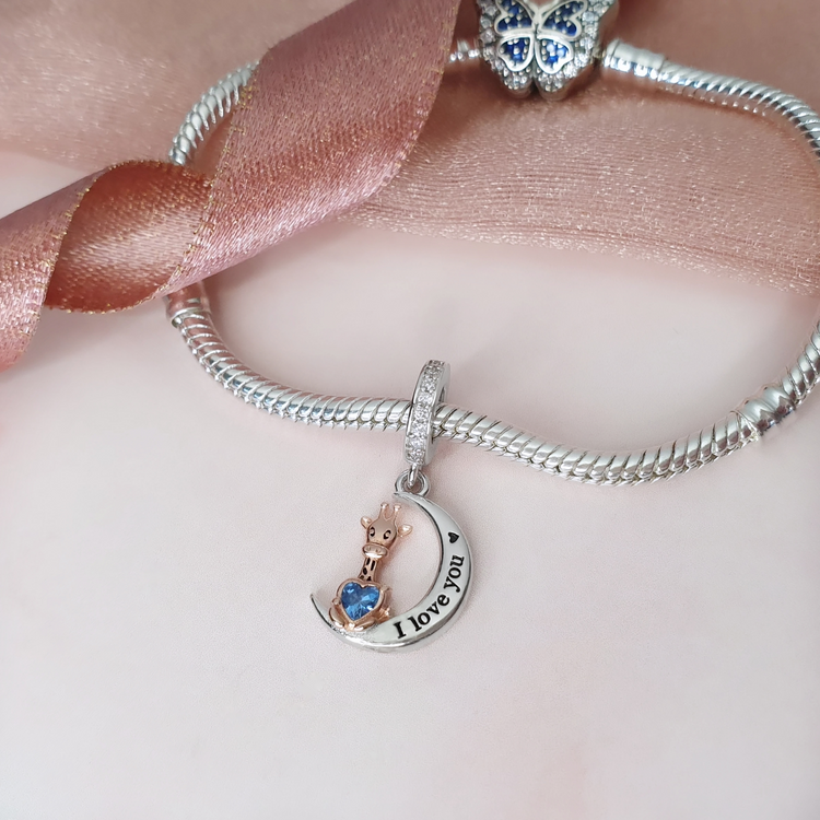 Beautiful and high quality two-tone rose gold and 925 sterling silver Moon shaped dangle charm featuring a cute Giraffe holding a blue crystal heart. The Moon is inscribed with 'I love you' and the bail is embellished with sparkling clear cubic zirconia crystals; a gorgeous gift for someone special.