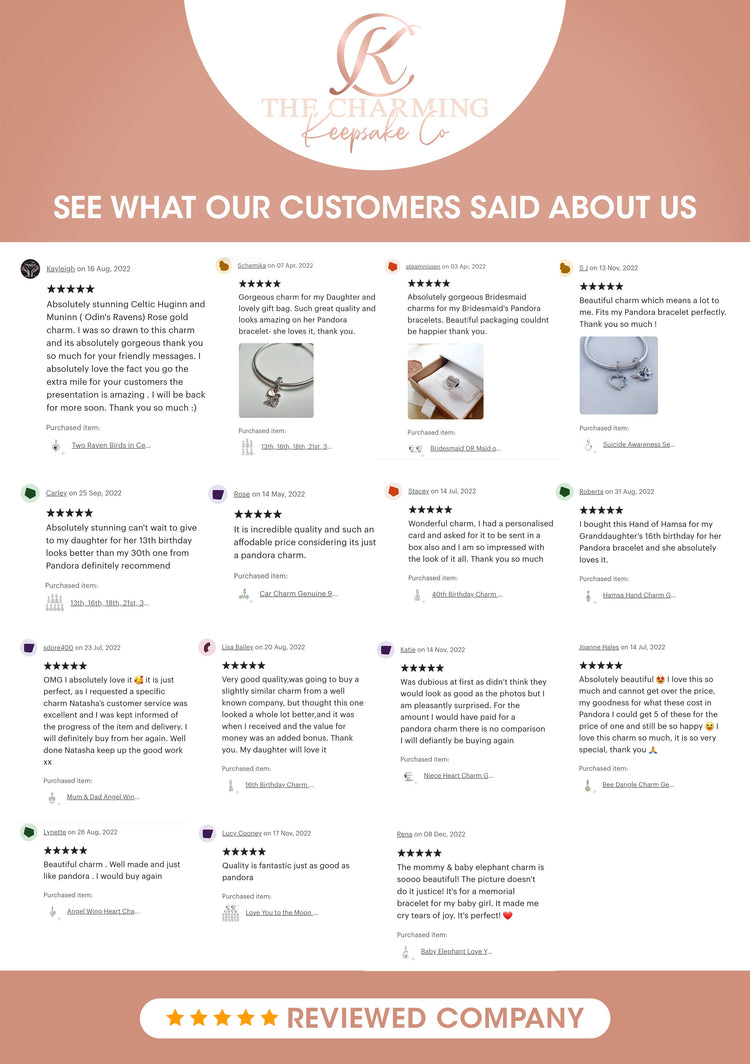 Your charm will be beautifully packaged in our Charming Keepsake Co white and rose gold velvet gift bag. If you would prefer a Charming Keepsake Co white and rose gold gift box please add a message at checkout stating 'Gift Box'.