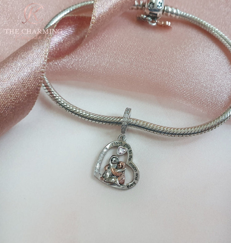 Beautiful heart shaped dangle charm crafted from high quality 925 Sterling Silver and embellished with sparkling clear cubic zirconia crystals. The charm features a two Sloths in rose gold and silver cuddling each other and is inscribed with 'I love you to the moon and back'; the perfect gift for someone special.