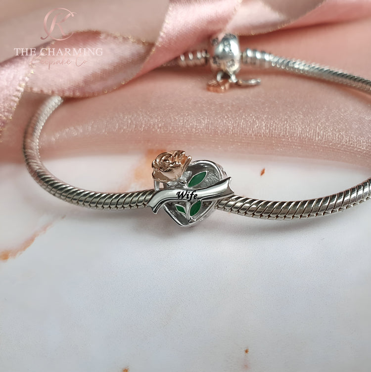 Beautiful openwork heart shaped charm crafted from high quality 925 Sterling Silver. The charm features a scroll engraved with 'Wife' and a rose gold plated rose flower decorated with green enamel. The reverse of the heart is engraved with 'Forever & Always'; the perfect gift for your Wife on a special occasion.