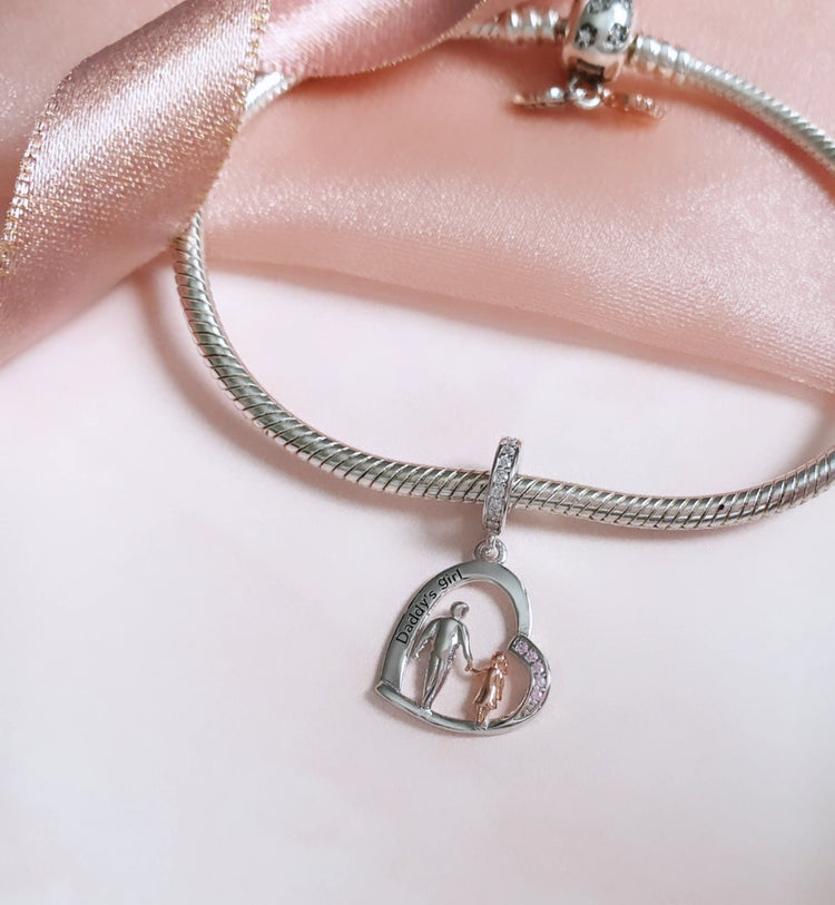 Wunderschöner und hochwertiger Charm aus 925er Sterlingsilber mit einem herzförmigen Anhänger, der mit funkelnden rosafarbenen Zirkonia-Kristallen verziert ist. Im Herzen befinden sich silberne und roségoldene Figuren eines Vaters und einer Tochter, die sich an den Händen halten. Der Anhänger ist mit einem kleinen Text mit der Aufschrift „Daddy's Girl“ beschriftet. eine wunderschöne Ergänzung für Ihr Bettelarmband oder Geschenk für einen besonderen Menschen.