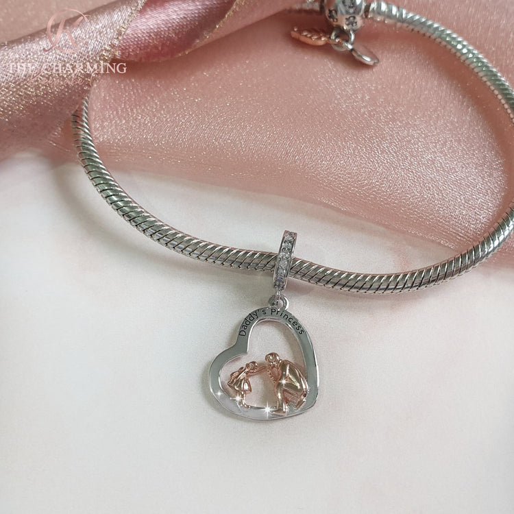 Wunderschöner und hochwertiger herzförmiger Anhänger aus 925er Sterlingsilber mit roségoldenen Figuren eines Vaters, der vor seiner Tochter kniet und ihr die Hand küsst. Der Anhänger ist mit funkelnden, klaren Zirkonia-Kristallen verziert und mit einem kleinen, zarten Text mit der Aufschrift „Daddy's Princess“ beschriftet. eine wunderschöne Ergänzung für Ihr Bettelarmband oder Geschenk für einen besonderen Menschen.