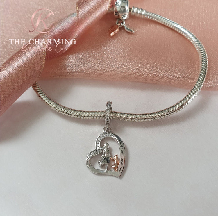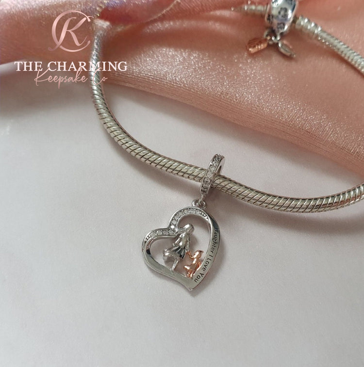Wunderschöner und hochwertiger Anhänger aus 925er Sterlingsilber mit einem herzförmigen Anhänger an einer Öse, verziert mit funkelnden, klaren Zirkonia-Kristallen. Im Herzen befinden sich Händchen haltende Mutter-Tochter-Figuren aus Roségold und Silber. Der Anhänger trägt die Aufschrift „Daughter I Love You“; eine wunderschöne Ergänzung für Ihr Bettelarmband oder Geschenk für Ihre besondere Tochter.