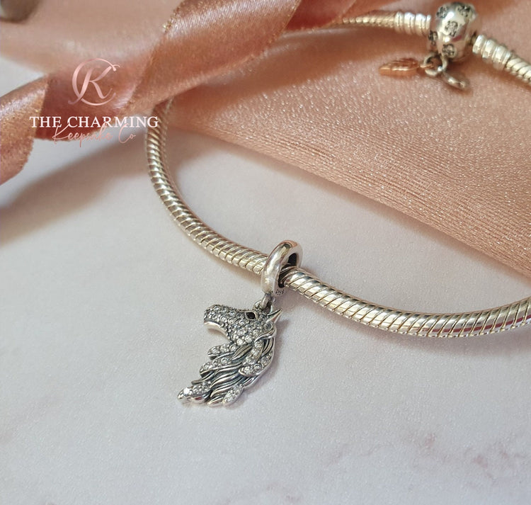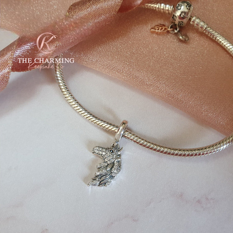 Wunderschöner und hochwertiger Anhänger aus 925er Sterlingsilber mit einem Pferd und seiner Mähne, verziert mit schimmernden, klaren Zirkonia-Kristallen (die Rückseite des Anhängers besteht aus schlichtem Silber); eine wunderschöne Ergänzung zu Ihrem Bettelarmband oder Geschenk für einen besonderen Menschen.