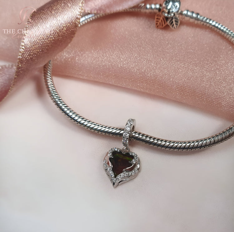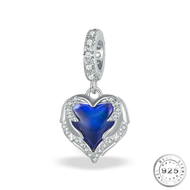 Wunderschöner und hochwertiger herzförmiger Anhänger aus 925er Sterlingsilber mit Engelsflügeln, verziert mit funkelnden klaren Zirkonia-Kristallen und einem Stimmungsstein, der im Sonnenlicht seine Farbe ändert (kann blau, grün oder braun sein); eine wunderschöne Ergänzung für Ihr Bettelarmband oder Geschenk für einen besonderen Menschen.