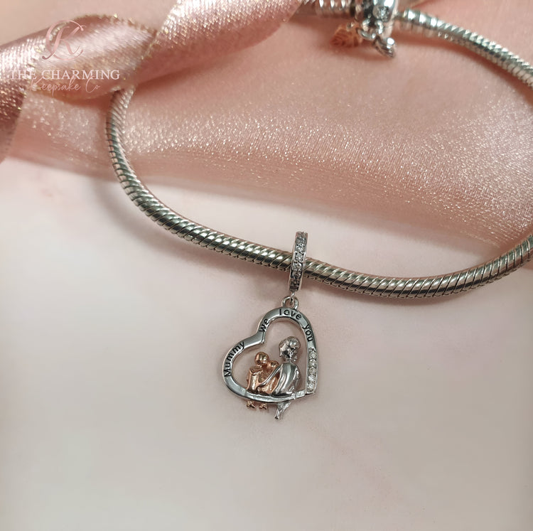 Wunderschöner und hochwertiger zweifarbiger Anhänger aus Roségold und 925er Sterlingsilber mit einem herzförmigen Anhänger, der mit funkelnden, klaren Zirkonia-Kristallen verziert ist und die Aufschrift „Mummy We Love You“ trägt.