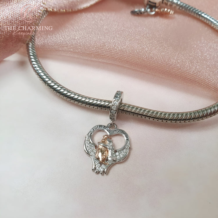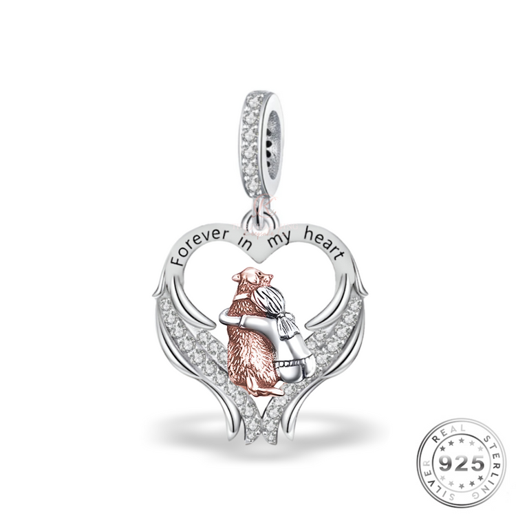 Wunderschöner und hochwertiger zweifarbiger Charm aus Roségold und 925er Sterlingsilber mit Engelsflügeln, die einen herzförmigen Anhänger bilden, verziert mit funkelnden, klaren Zirkonia-Kristallen. Innerhalb der Engelsflügel befindet sich eine weibliche Figur, die ihren Hund in den Armen hält. Der Anhänger trägt die Aufschrift „Forever in my heart“; ein wunderschöner Erinnerungsanhänger für Ihr Bettelarmband oder Geschenk für einen besonderen Menschen.